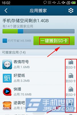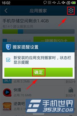 2)此时可点击一键搬到SD卡,也可以单个来选择,点击上方的设置键,勾选搬家提醒设置:新安装的应用支持搬家时,状态栏显示提醒。