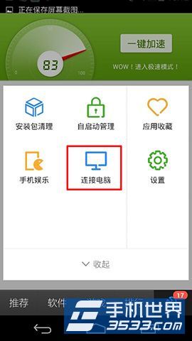 3)点击进入手机助手,然后点击“连接手机”就可以看到左上角的二维码,点击扫描电脑上的二维码就可以完成连接电脑了。