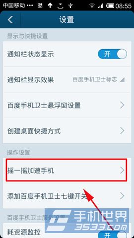1)打开百度手机卫士软件,进入百度手机卫士后点击右上角的“…”,然后再点击“系统设置”,并找到“摇一摇加速手机”。