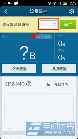 3)此时会跳转到省流量助手,可以点击开启,也可点击不开启,退出省流量助手,回到流量监控界面, 设置套餐限额,输入数值后点击确定;