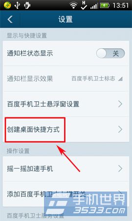 2)在显示出的功能列表中按系统“设置”按键,进入设置界面后,按“创建桌面快捷方式”按键。