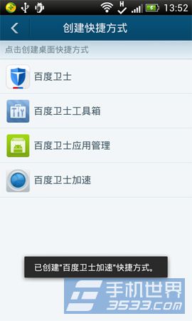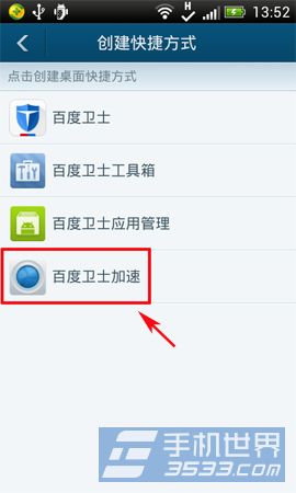 3)进入创建桌面快捷方式界面后,点击“百度手机卫士加速”按键。