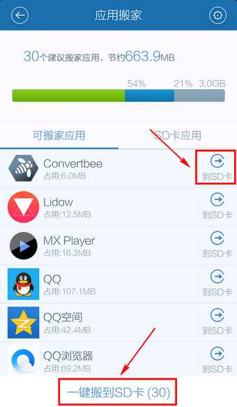 3.显示【可搬家应用】,可选择将某个APP搬到SD卡或者【一键搬到SD卡】
