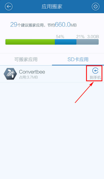 5.可在【SD卡应用】中查看已搬家的APP,还可选择搬回【到手机】