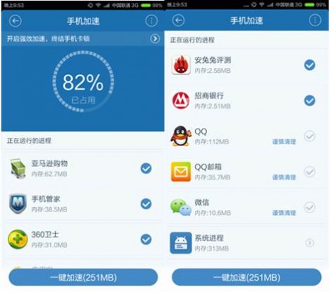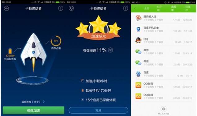 从三款软件加速测评结果来看,360手机卫士、腾讯手机管家加速功能能够对手机系统进行短暂的加速,然而由于没能从根本上遏制手机软件的自动运行,因而会出现反弹的情况,这也导致了大部分用户需要每天对手机进行多次加速操作,手机仍然加速不明显的情况。目前,百度手机卫士手机加速功能实现了免root操作下,对安卓手机后台运行程序的关闭,因此这些进程不会再接受系统发出的消息,从而就不会被自动激活,直到用户主动开启这个应用,真正实现“一次加速,48小时内不反弹”的效果,这对安卓用户来说是一大乐事。
