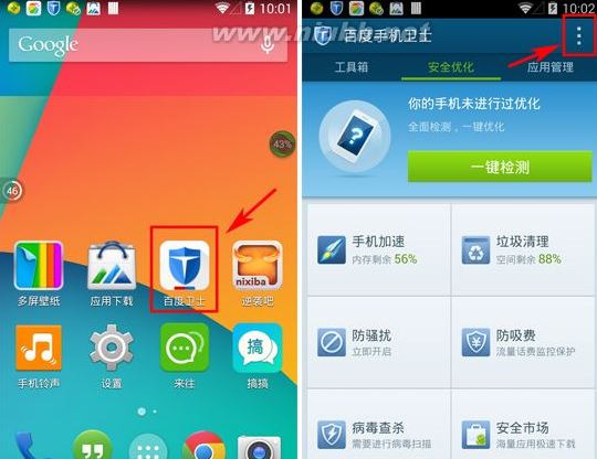 1、首先打开百度手机卫士,在进入首页,点击“三点”按键。