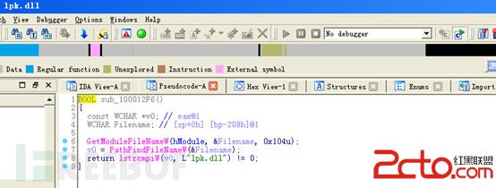第一步以xp系统为例(win7修改注册表即可),xp系统本身的lpk.dll文件位于C:\WINDOWS\system32和C:WINDOWS\system\dllcache目录下。lpk.dll病毒的典型特征是感染存在可执行文件的目录,并隐藏自身,删除后又再生成,当同目录中的exe文件运行时,lpk.dll就会被Windows动态链接,这个病毒加载起来之后立即定位自己的位置,激活恶意代码: