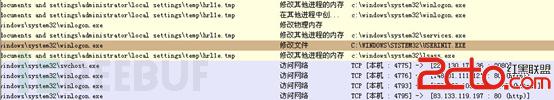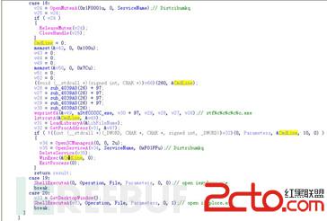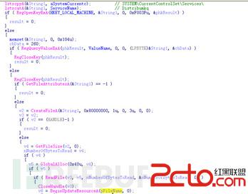 基本的特点就是创建一个名字为Distribumkq的系统服务,插入IE浏览器进程,在堆中申请空间通过资源更新的方式写入自身,并且执行。 这些都是远程控制恶意代码的惯用伎俩,在此就不一一详述了。可以确定的是,这是一个具备控制能力的感染型病毒。