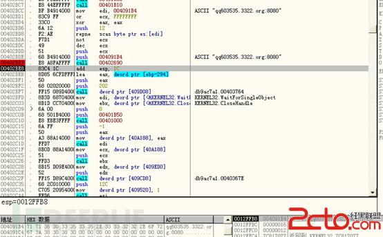 从上面我们可以看到有一个.tmp的文件生成并且不断的执行恶意代码,这个隐藏的文件就是真正的控制部分,控制部分肯定有域名或者固定ip,顺着这个思路,内存抓取该文件继续分析,通过调试找到了病毒的真正主人: