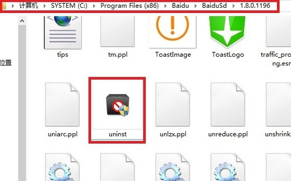 2、进入百度杀毒默认安装路径:C:Program Files (x86)BaiduBaiduSd,双击uninst卸载程序,进行常规卸载