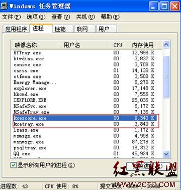 (1)占用内存。金山毒霸2012据说最大的亮点是快,运行毒霸2012后,笔者迫不及待的想了解下内存占用的情况,结果发现进程管理器里仅显示2个进程,占用内存仅有10M左右,可以说与同类杀毒软件相比,已经相当小。