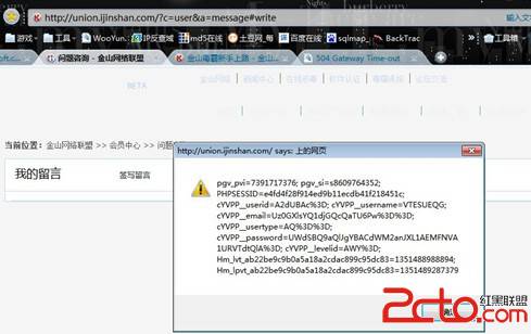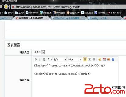 金山毒霸存储型XSS一枚。 金山毒霸---金山网络联盟留言板处存在存储型XSS,没有对<>等符号做过滤。。 只是过滤了“”双引号 可以直接执行跨站语句 详细的,看图吧。。。 漏洞地址:http://union.ijinshan.com/?c=user&a=message#write 还有个sql注入漏洞,页面不知道怎么,一直打不开……晚点提交吧。。