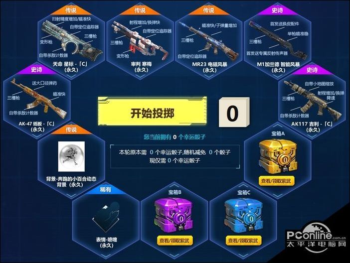 4.消耗幸运骰子进行投掷,每次投掷必得11个奖励中的一个(已抽到的奖励将被剔除并不会再被抽到)。其中有3个为宝箱,可自由选择其中的道具;