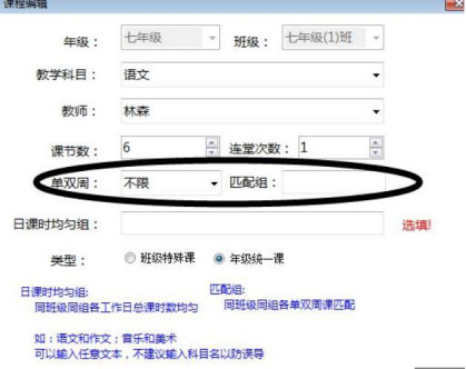 可以针对课程设置单双周课,比如单周周一第七节上音乐,双周周一第七节上美术,这个时候我们就可以将音乐和美术设置为单双周课。当出现多个单双周课的时候还可以将需要合在一起的课程设置匹配组,这样在只能排课的时候就可以按照匹配组自动将设置好的单双周课排在一起了。