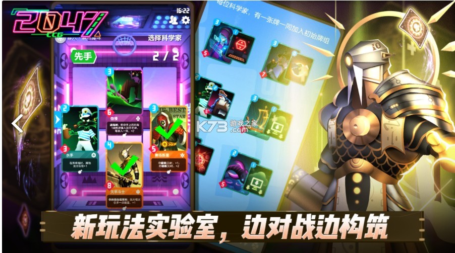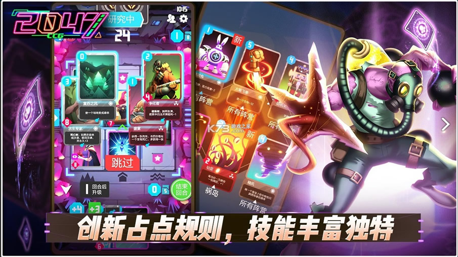 《2047》是一款未来风的竖屏手机TCG游戏。游戏的规则采用田忌赛马的方式,玩家争夺三个场地上的据点,先获得两个的取胜。