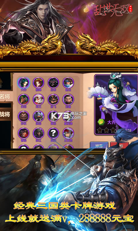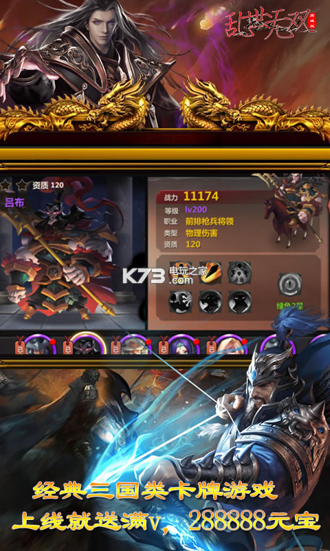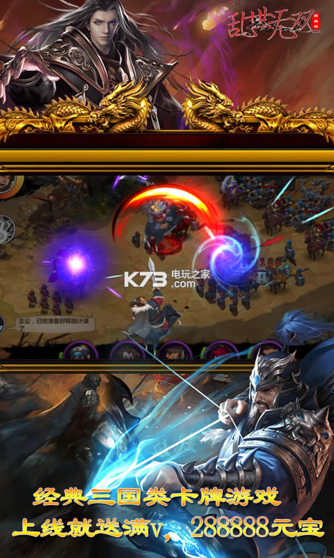 《乱世无双》热血动作卡牌王者之作!游卡手游巨制上线送VIP、VIP特权、海量元宝,海量资源,激活GM商城无限获取海量资源。游戏华丽画风,名将云集!炫酷合击,热血战斗!