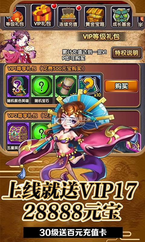 《乱世祭百抽版》是一款三国对战类策略卡牌手机游戏。上线就送VIP17,28888元宝,平台直接领取酒馆百连抽门票,上线就狂抽!首日轻松升到30级拿百元充值卡直升满V!V18即可花费500元宝购买成长基金狂得16w元宝返还!除了我们海量的福利,你爱的三国人物都在这里!华丽震撼的貂蝉妹妹,华丽萌动的三国世界,流畅动感的打斗画面,为三国玩家深度定制一款不一样的三国世界!快PICK你最中意的组合,组成你自己的全猛将战队,加入乱世中的三国大乱斗吧。
