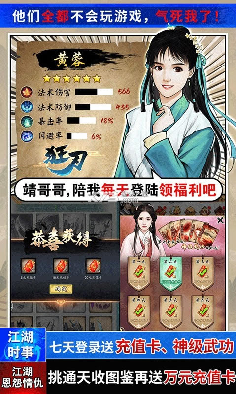5、七天登录送6000元充值卡、神级武功,更有全套甲级装备等。