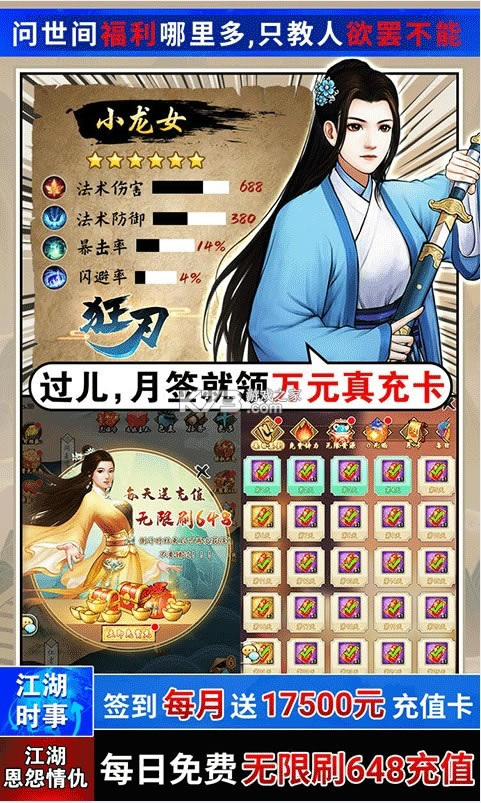 3、签到每月送17500元充值卡,每日免费无限刷648充值,元宝领到手软。