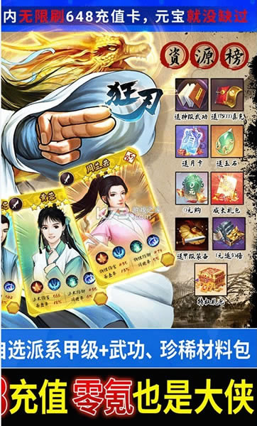 1、上线送满V(VIP20),自选派系甲级+武功和装备、珍稀材料包(元宝*150000、培元丹*88888、银两*1500万)。