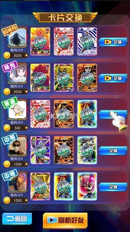 一款非常不错的趣味卡牌战斗与挑战游戏,游戏画面精致,玩法简单,容易操作,玩家只需要将抽取到稀有的卡牌来和你的好友进行交换,你可以提前查看到好友心仪的卡片,并要求对方更换更稀有的卡进行交换,然后不断的换到更稀有的卡,同时游戏中不同卡牌角色的战斗技能都是不同的,所有都十分的宝贵,玩家可以自由的找寻到不同的人物卡牌来与对手替换,一定要领取到最强ur卡哟,然后换走你的UR卡,很轻松的养成游戏模式可以为玩家带来非常好的游戏体验感!