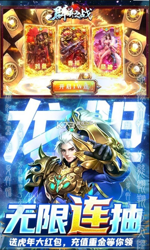 2.登陆送虎年大红包,自选势力阵容礼包,VIP直升V20,活动页面最高可领取2022元赠礼,持续登陆送充值,送连抽,满V满英雄再也不是梦。记得去“登陆送充值卡,连抽”界面领取加强版福利:整整10000+充值和10000抽,不领白不领,平民也能爽快战斗!