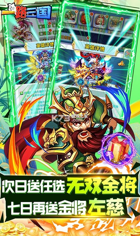 《一路三国》战斗过程无需操作,打造个性的人物,连续登录就送海量资源宠物免费拿,送元宝和进阶丹和体力,免费领取豪华的特权,送金将福利,每日在线再领2千真充,打造属于你的三国霸业,三国卡牌等你探索,福利满满探索三国世界。