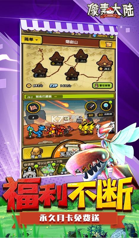 《像素大陆》开局狂送彩钻,突破属性不肝不氪全拼战术,放置白嫖无限抽赢在起跑线上,拼战术签到送50连抽,选择不同的精灵去冒险,放置白嫖天花板,萌宠养成首充礼包直接领,领取海量的道具,福利不断在线领。