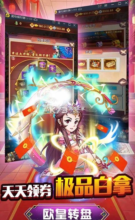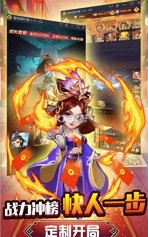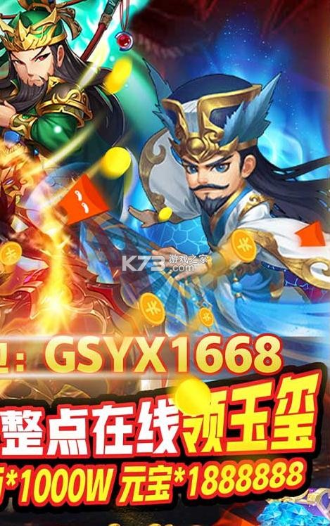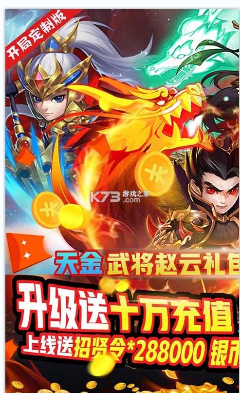 多样武将养成,剧情发展紧张刺激。福利多多,元宝多多!上线就送招贤令*288000、银币*1000W、元宝*1888888,更有1980元真充卡免费送;