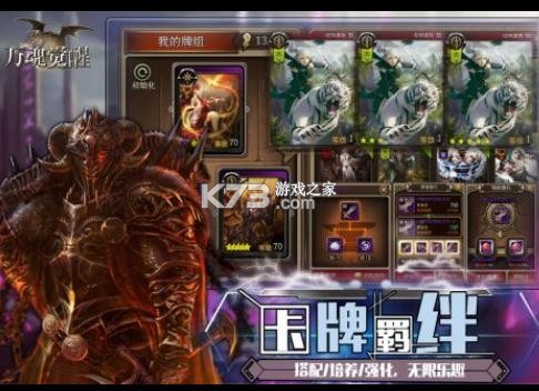 《万魂觉醒》是使用了百余张高品质写实风格美术的卡牌对战角色扮演类游戏。 卡牌共分为人类,怪兽,妖精,条顿,天使,龙,恶魔七个种族与支援,防御,万能,攻击,策略类型的五个职业。通过种族,职业的组合,可搭配出无限种牌组,使用依照自己策略搭配出的牌组与其他玩家对战,从中获得成就感与乐趣