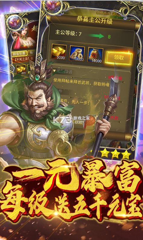 6、每级都送5000元宝,超多粮草铜钱随意送,升级节奏更是提高50%,全程顺畅闯关,一直领钱一直爽!
