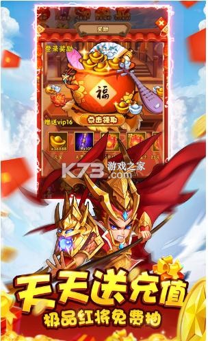 ★后缀说明:登录就送价值万元的满级VIP体验;在线挂机就能拿充值卡碎片,充值卡碎片可以在背包中合成高额档位充值卡进行游戏内消费;开服送神将随机礼盒,开启即可获得一员极品神将;登录满七天还送游戏内稀有极品时装;