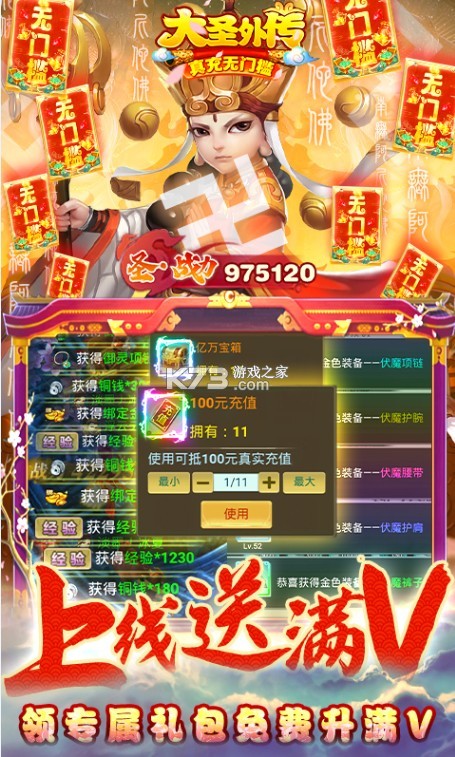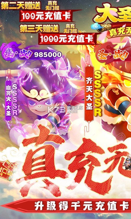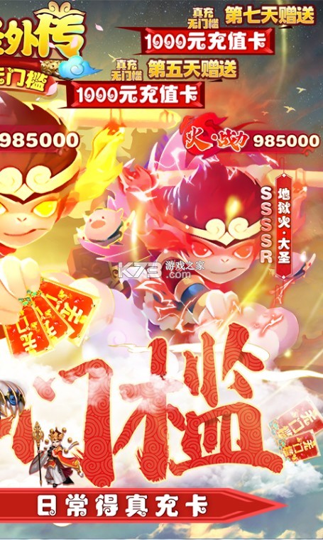 《大圣外传-真充无门槛》是一款放置挂机类多人在线角色扮演类游戏。开局即送满V,任意畅玩游戏无压力。八日登录送3100元真充卡,线上活动除首充外均可参加,无时间限制,无等级限制,零充无压力。每日签到送海量材料,大幅增加战力,畅玩无压力!