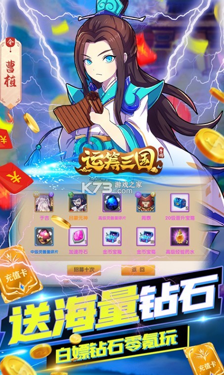登录送满V,钻石*88888,金币*300W,1500元充值卡,海量资源免费送!畅爽体验!天下大势,合久必分,梦回三国之时,多少风流人物,你又是否想过自己成就一番宏图霸业?这一次《运筹三国》为你还原乱世之景,这里有独特的九宫格战法让你施展谋略,刘关张等多名英雄武将随你征战沙场。符文洗练、英雄专属装备、超炫合体技等多维度培养方式让你手下的武将快速成长!收集家园材料开国建城,还有宠物上阵助您实力超群;多重跨服争霸玩法,多种社交情缘玩法,与跨服对手的一较高下,开拓您专属的霸主之路!