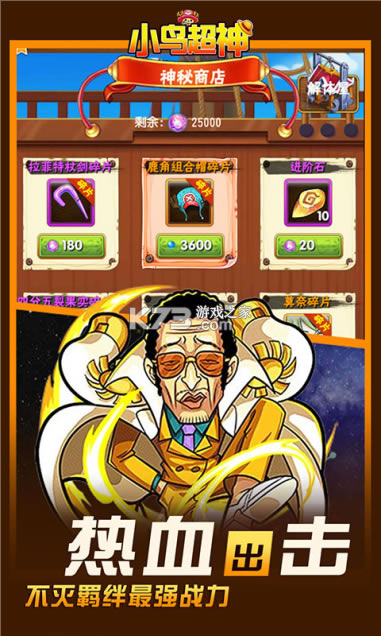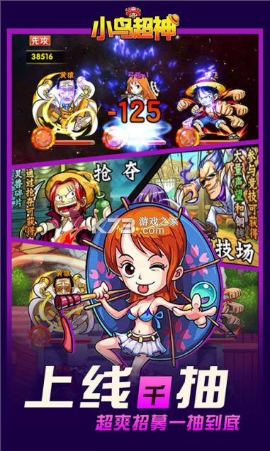 《小鸟超神-送GM无限充》日漫经典大航海题材手游来袭!高度还原了原动漫中的角色与剧情,众多熟悉的面孔为你呈现,给你最真实的动漫手游!游戏人物设计全面贴合原作设定,用心打磨场景、动作细节刻画,无损还原粉丝心目中的大海盗时代。游戏中草帽一伙、白胡子、比斯塔、乔兹等实力伙伴悉数集结,海量福利等你领取!