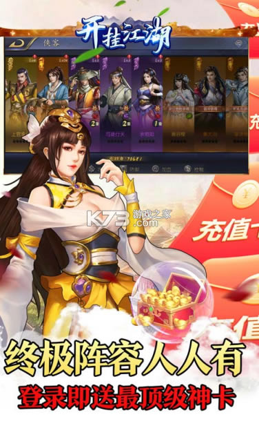 《开挂江湖》是一款经典国风即时回合制卡牌手游。开局送满V,创角送20W元宝、百连抽,ssr神卡李沐情。登录送10000充值卡、每天登陆每天送,不花钱也能爽快玩。经典剧情原汁还原、多职业策略玩法斗智斗勇,真实、热血的浪子江湖!——致敬东方武侠文化,国风武侠系列扛鼎代表作,原汁原味还原每个人心中的江湖梦!长剑醉,浪子归,你的江湖浪子路即刻启程!