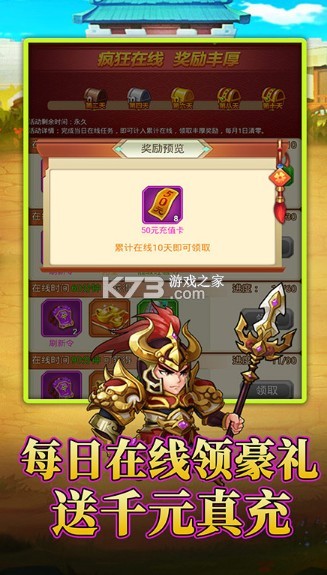 《超神挂机-欧皇无限充》是一款制作精良的卡牌回合制游戏,上线就送200元真充卡VIP10,在线礼包送豪礼累计可以领取千元充值卡。