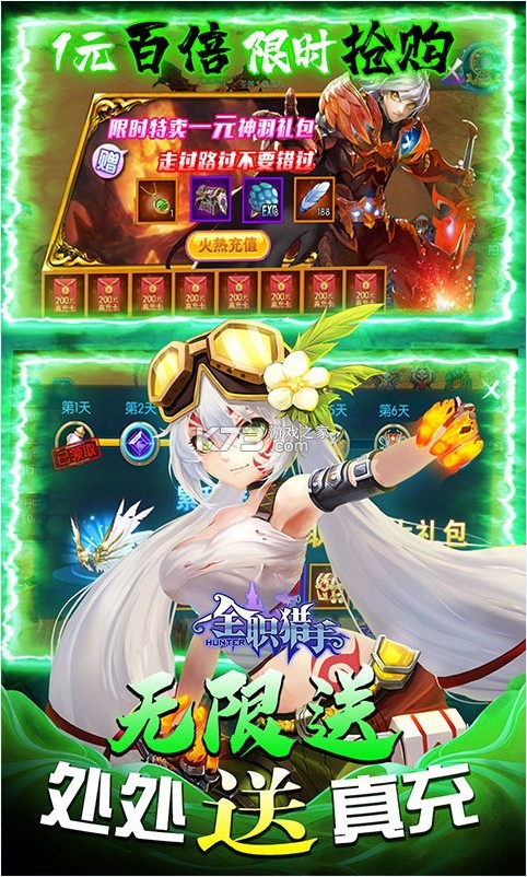 《全职猎手》每日挑战必爆真充,七日登录再送千元真充福利,无限送宠物和经验果实,具有超强大的杀伤力,剧情百变热血冒险,集结伙伴开启史诗级的冒险,画风清新打造独特的四大职业,多人搭配多重组合给你最趣味的游戏。
