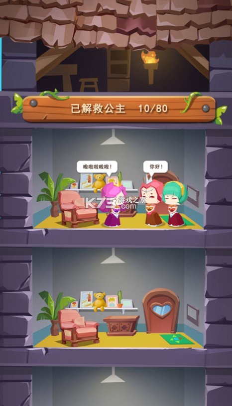 一款十分益智的休闲闯关游戏,游戏中玩家需要扮演王子击破牢笼来拯救公主,游戏内提供多套时装,可做收集每个关卡都绘制了不同的公主形象,每通关一个关卡就会将公主救回城堡。