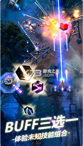 激战、爽快、突袭,击溃,所有的攻击都行云流水,这就是无双战机带来的超级体验。随机三选一的升级功能,让战机的攻击方式在战斗中自由搭配、任意组合,DIY攻击套路让你体会到更多爽快感受。