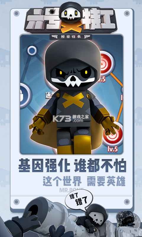 畅快射击只需轻轻一点,策略搭配全在一念之间!《六号特工秘密行动》是由酷帅有范、好玩有梗的MR.BONE正版授权的休闲手游。在这个满是脏丝的世界,有着丰富的场景、爽快的战斗、酷炫的武器和个性十足的角色,谁会成为最强特工呢?