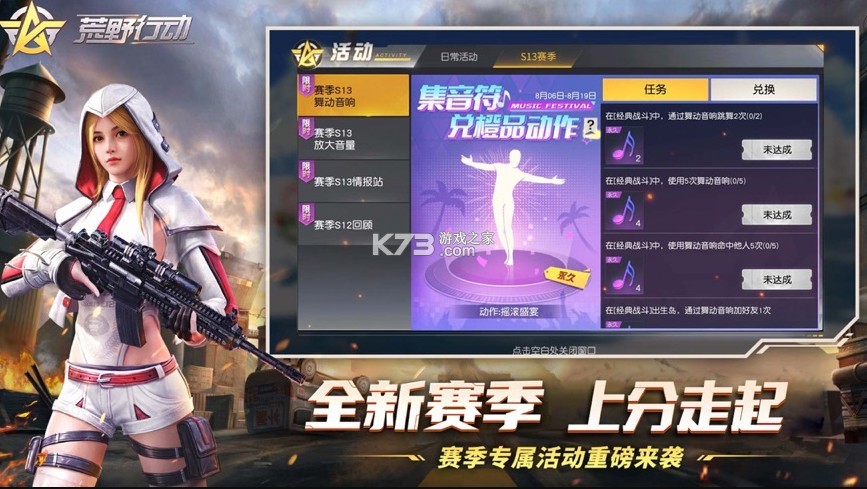 《荒野行动》s14赛季带领大家进入一个新的赛季挑战了,全新的《荒野行动》排位赛的启动让大家体验更精彩的内容,手游中还有音乐节的新模式,全新的生存吃鸡挑战就在这个赛季。玩家们也可以进入新的吃鸡模式了,带给无限的吃鸡精彩。