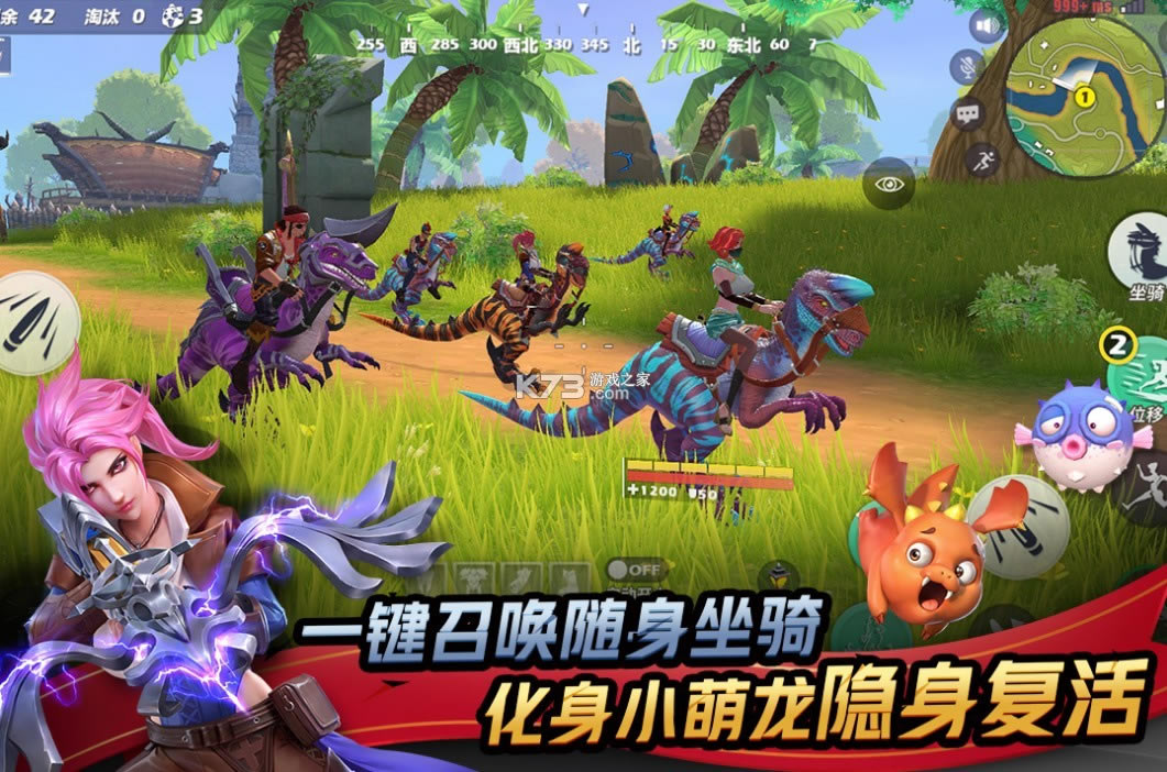 游戏创新加入RPG元素,独创随身恐龙坐骑,不再为载具寻觅而困扰,一键召唤策马奔腾!游戏全新突破,不再落地成盒!死亡化身小萌龙,坚持躲避逃跑就能原地复活!更有趣味“捉迷藏”玩法等着你,小心那些石头、树木,可能它们就是“敌人”的化身!