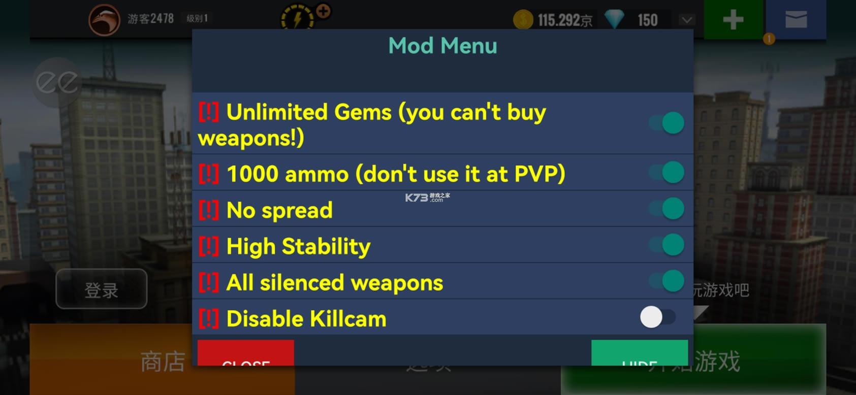 破解内容:【说明】MOD菜单模组,使用前请开启游戏的悬浮权限并在进入游戏后点击左上角图标开启对应的修改选项。1.伤害倍数 [x1 – x1000] 2.最大弹药(无限子弹) 3.没有装弹CD 4.无扩散反冲 5.无限水晶(不能购买武器) 6.无限金币 7.无限能量 8.一些高级功能可用 9.已移除广告