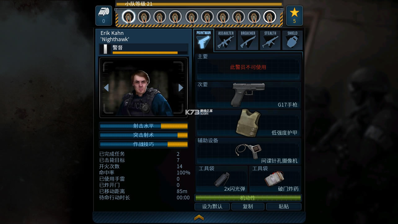 每位特警都拥有不同的装备,根据状况切换武器才能保证安全,例如游戏中可以发出先丢一枚烟雾弹,然后再进行冲锋的指令。