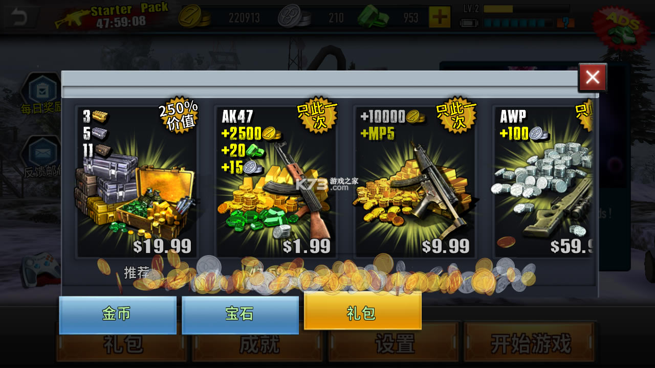 手枪,步枪,霰弹枪,狙击枪,特制武器共计38款其中包含AK47,M4,AWP等世界著名枪械,开创性的采用3种游戏货币,不同的枪械需要不同的游戏币购买,所以为了你喜欢的枪械,赶快赚取对应的游戏币吧! 除了一般的武器之外,还有手雷等投掷武器可以选择,甚至包括医疗箱,弹药箱,特殊子弹等强力道具,有了这些装备辅助你的枪械,绝对会更强;