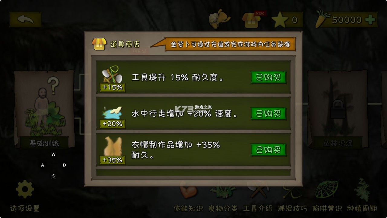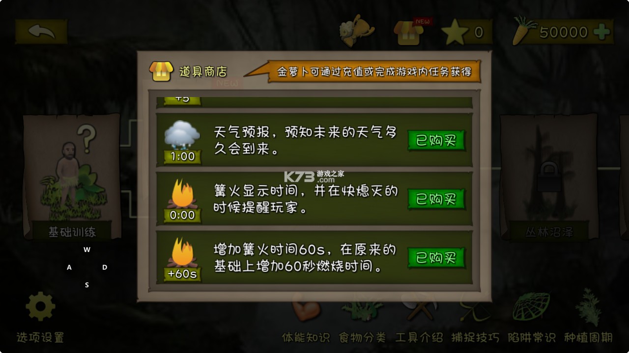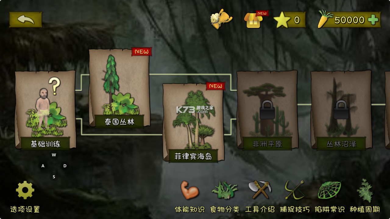 游戏中有不少投掷类工具,石头,竹叉,弓箭。有时候你会碰到一些猎物,如草原上的兔子,池塘里的鱼。你需要用你的投掷工具瞄准猎物进行猎杀,当然不同的猎物需要不同的投掷工具。