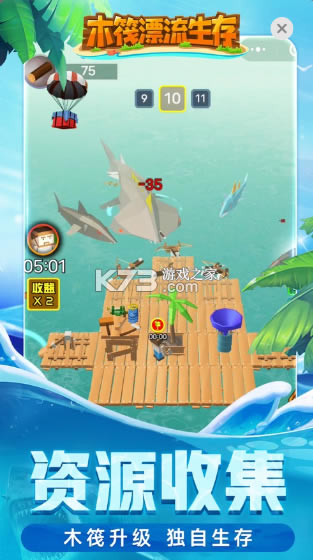 收集各种资源,扩大木筏