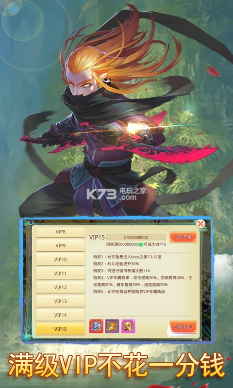 登录游戏,立即赠送永久VIP15的最高特权,不花钱也能当土豪!