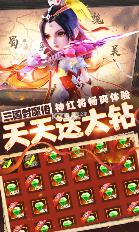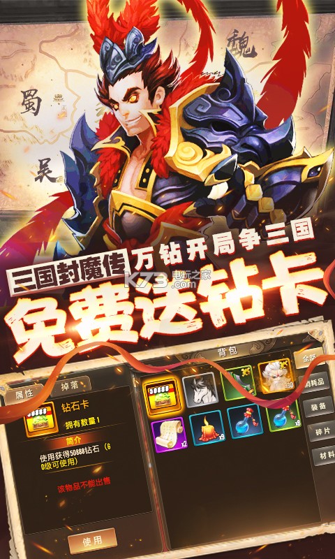 ★上线免费赠送万钻卡,50888钻石、送VIP18、十万钻石开局,开展三国版图